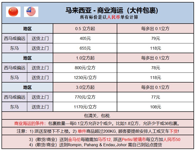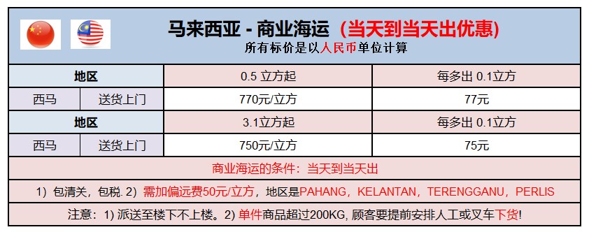 4. 海运偏远,深山区与东海岸地区: 玻璃市PERLIS,彭亨州PAHANG,丁加奴TERENGGANU,吉兰丹KELANTAN,马泰边界,最低消费0.5立方 (注意:高山区额外加 RMB80/立方最低消费1立方如,云顶,金马伦,福龙港及五吉丁宜和不能直到的海岛区如Pulau Langkawi, Ketam,Pangkor等等只派送至码头附近费另外算